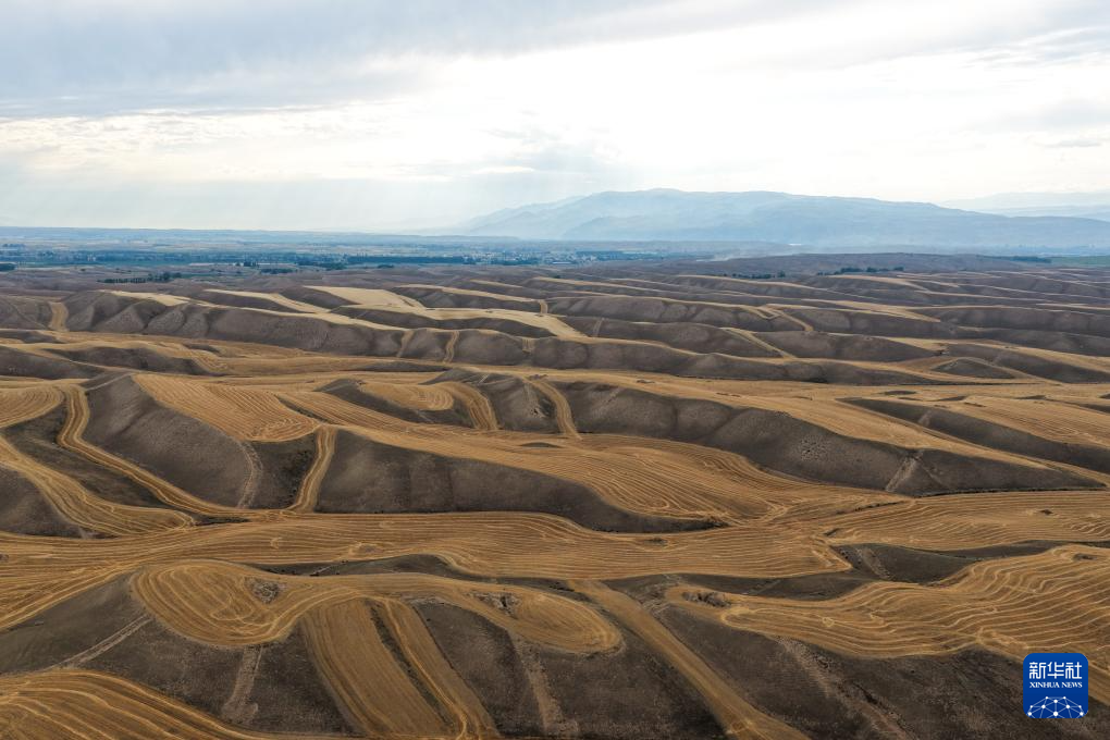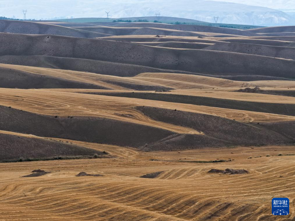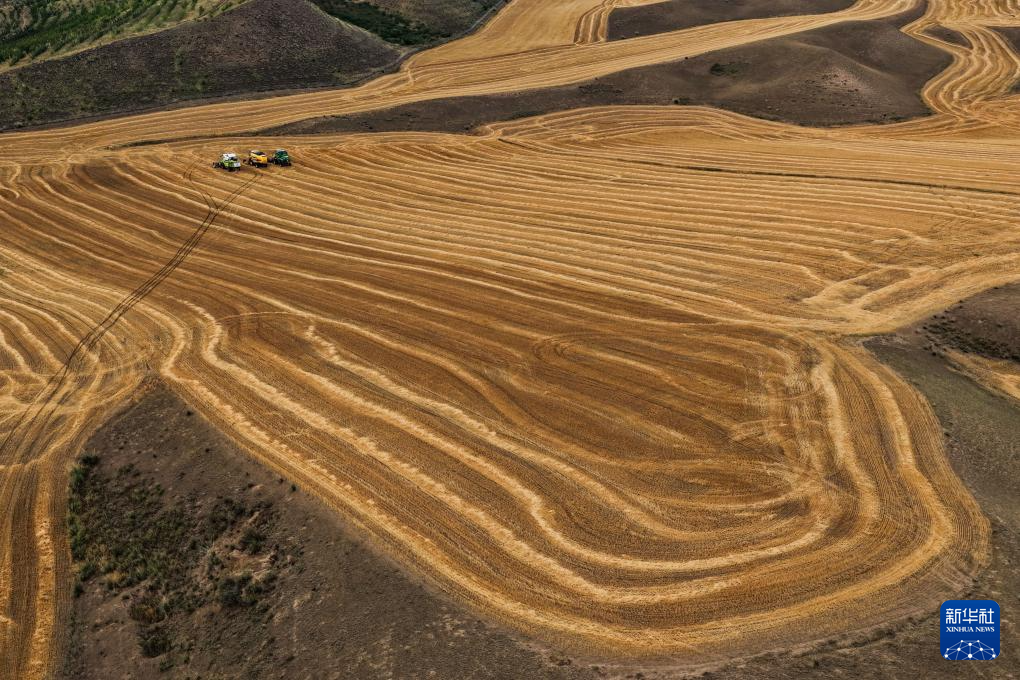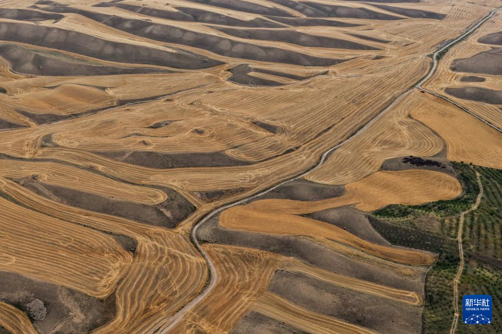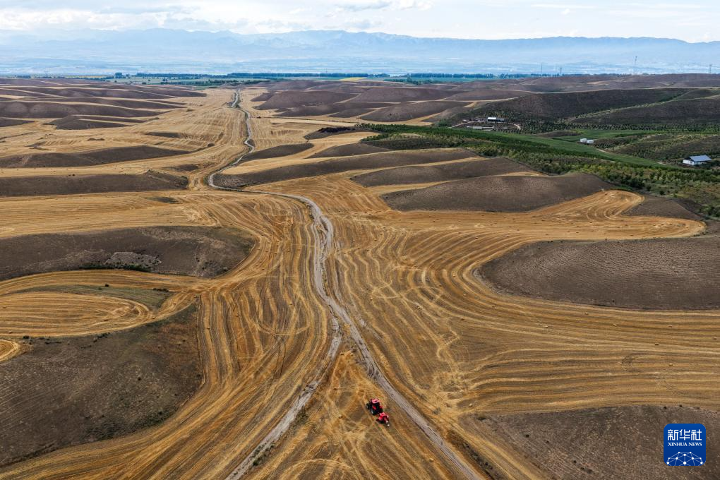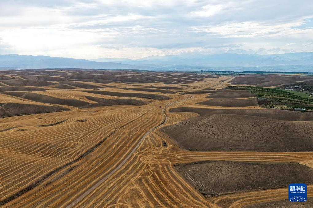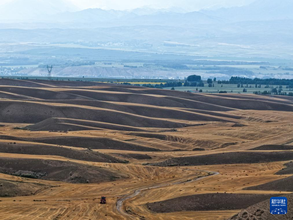 近日,在位于天山北麓的新疆維吾爾自治區(qū)伊犁哈薩克自治州特克斯縣,成熟的小麥迎來收獲。當(dāng)?shù)剞r(nóng)民搶抓有利天氣,開展夏收工作。