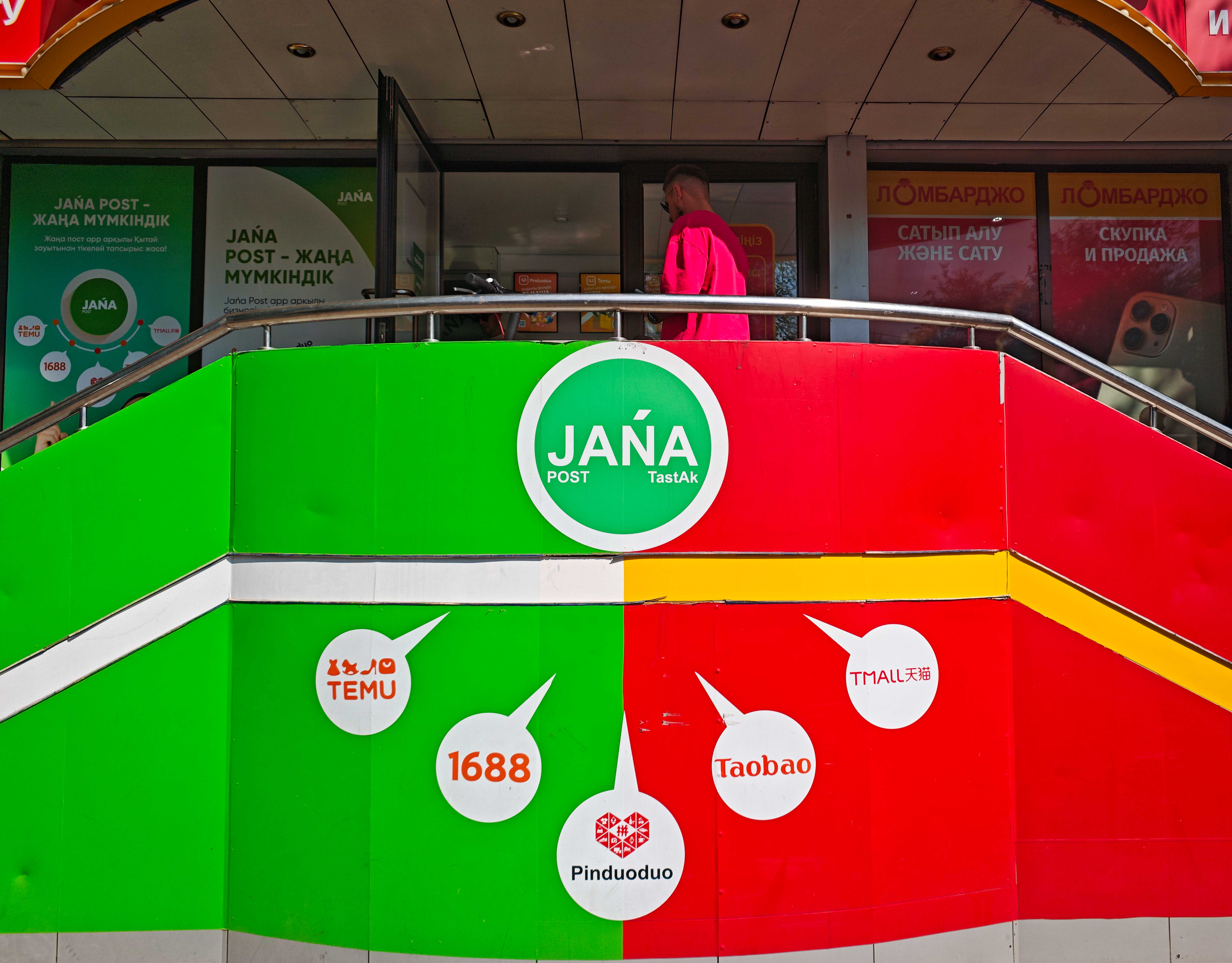 這是9月3日在哈薩克斯坦阿拉木圖一家主要負(fù)責(zé)中國網(wǎng)購平臺(tái)物流服務(wù)的快遞網(wǎng)點(diǎn)外拍攝的宣傳標(biāo)識(shí)。(新華社記者李任滋攝)