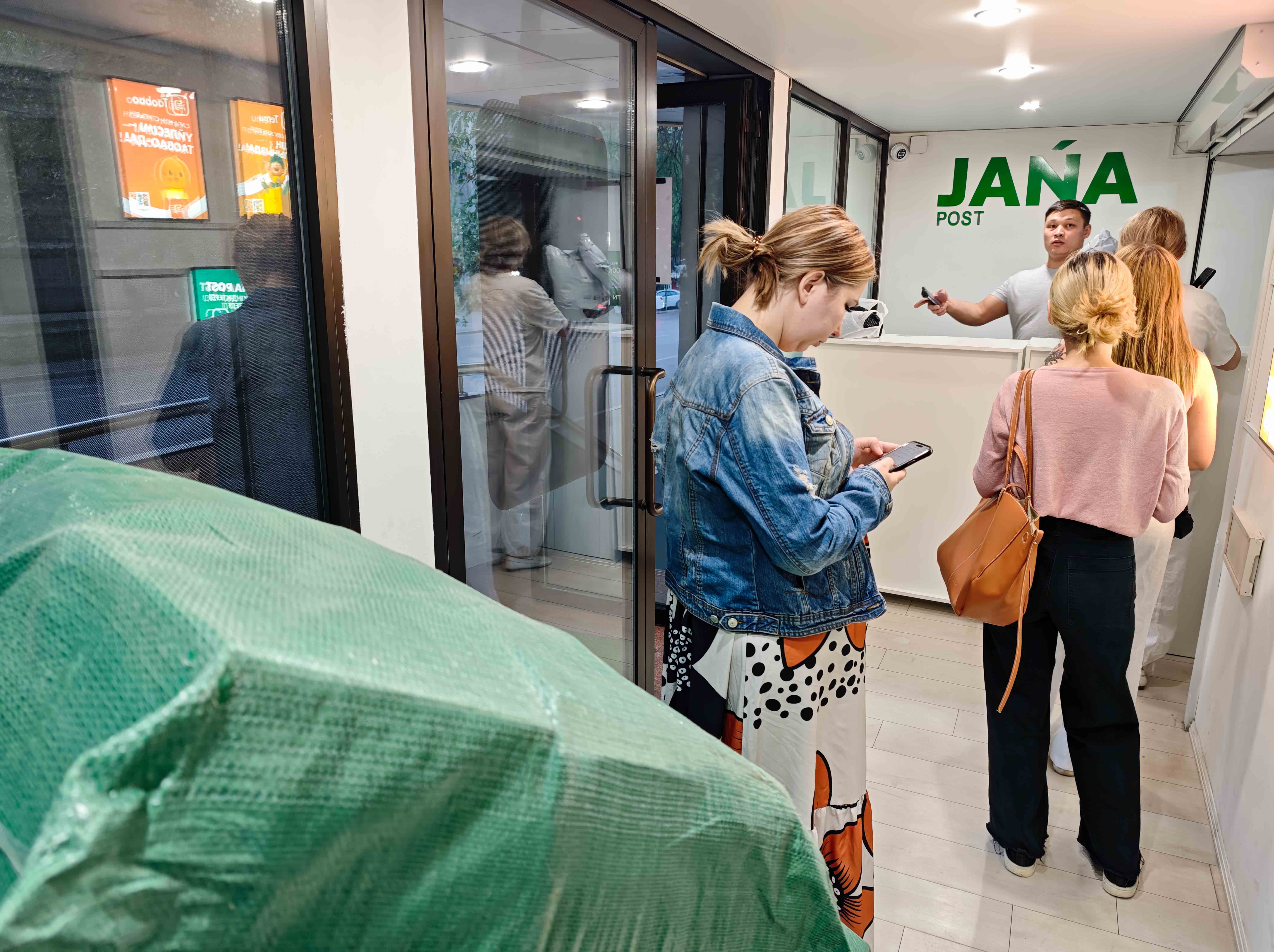 5月25日,在哈薩克斯坦阿拉木圖,人們?cè)谝患抑饕?fù)責(zé)中國網(wǎng)購平臺(tái)物流服務(wù)的快遞網(wǎng)點(diǎn)排隊(duì)等待自提。(新華社記者李任滋攝)