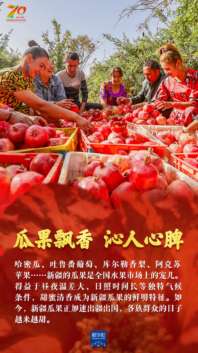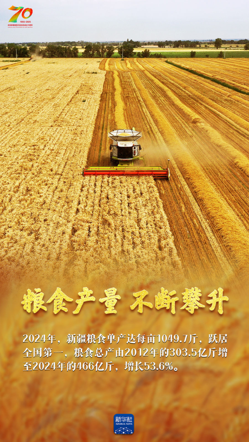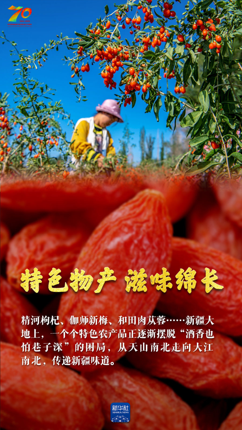正是豐收好光景,天山南北倉廩實。今年是新疆維吾爾自治區(qū)成立70周年,70年來新疆農(nóng)業(yè)生產(chǎn)發(fā)生了翻天覆地的變化:人均口糧從不足200公斤到糧食單產(chǎn)躍居全國第一;棉花占全國總產(chǎn)量的比重超過九成;離海最遠的新疆成為多種海鮮出口地;皮亞曼的石榴、吐魯番的葡萄、庫爾勒的香梨、阿克蘇的蘋果……更是甜醉了全國人民的味蕾。讓我們跟隨這組海報,領(lǐng)略豐收里的大美新疆。