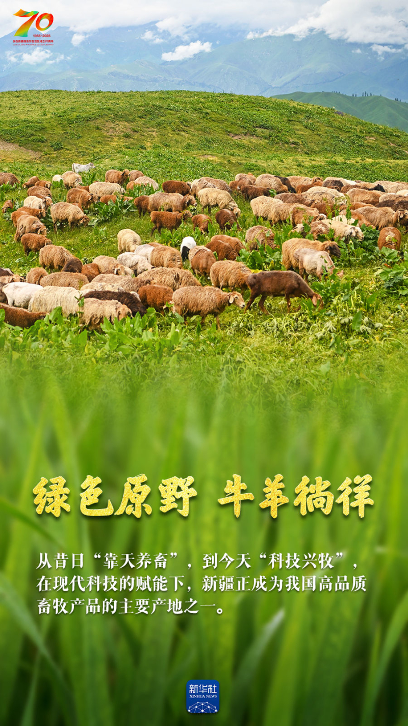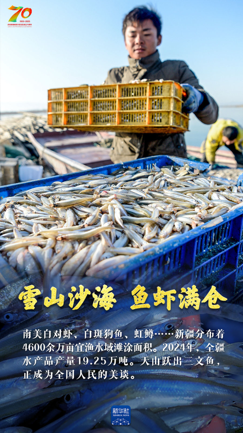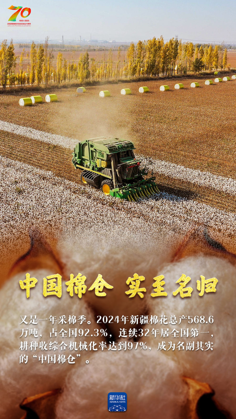 正是豐收好光景,天山南北倉廩實。今年是新疆維吾爾自治區(qū)成立70周年,70年來新疆農(nóng)業(yè)生產(chǎn)發(fā)生了翻天覆地的變化:人均口糧從不足200公斤到糧食單產(chǎn)躍居全國第一;棉花占全國總產(chǎn)量的比重超過九成;離海最遠的新疆成為多種海鮮出口地;皮亞曼的石榴、吐魯番的葡萄、庫爾勒的香梨、阿克蘇的蘋果……更是甜醉了全國人民的味蕾。讓我們跟隨這組海報,領(lǐng)略豐收里的大美新疆。