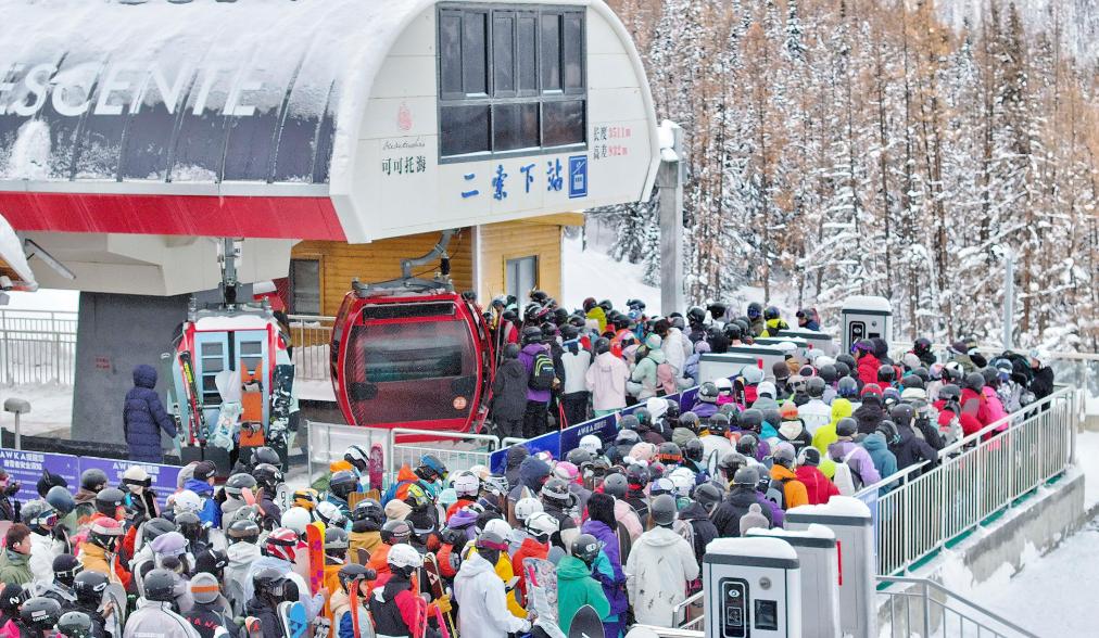 2024年11月,游客在可可托海國(guó)際滑雪度假區(qū)排隊(duì)等候乘坐纜車。新華社記者 胡虎虎 攝
