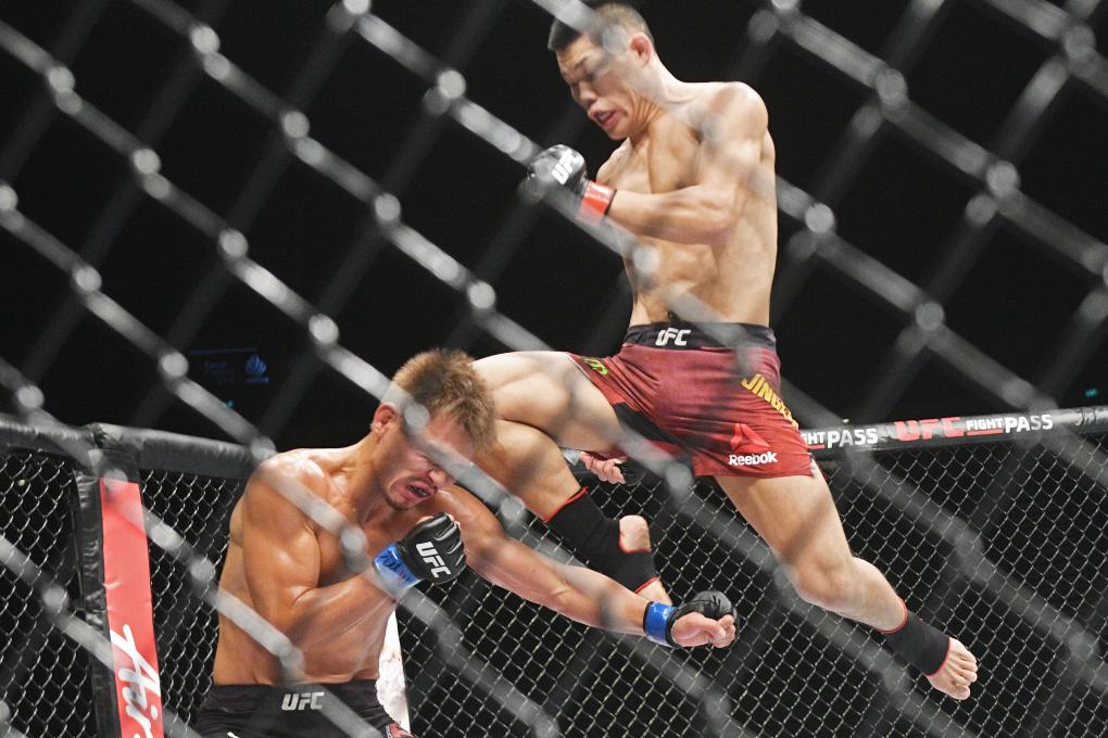 2018年6月,李景亮(右)與日本選手阿布大治在比賽中。新華社發(fā)(鄧智煒攝)