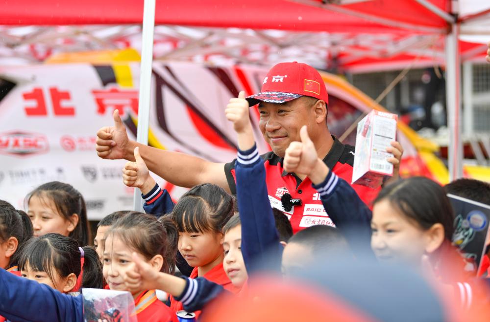 2023年5月,北京汽車車隊(duì)領(lǐng)航員陳峰在環(huán)塔營(yíng)地與當(dāng)?shù)匦W(xué)生們合影。新華社記者 胡虎虎 攝