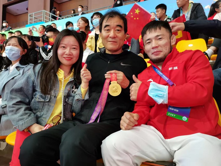 2021年陜西全運(yùn)會(huì)期間,劉泳太(中)與奪得金牌的弟子托爾巴圖(右)合影。