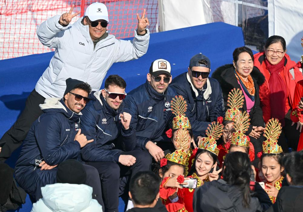 2025年2月,參加中國(guó)國(guó)際雪地排球邀請(qǐng)賽的法國(guó)選手與文藝表演者合影。新華社記者 胡虎虎 攝