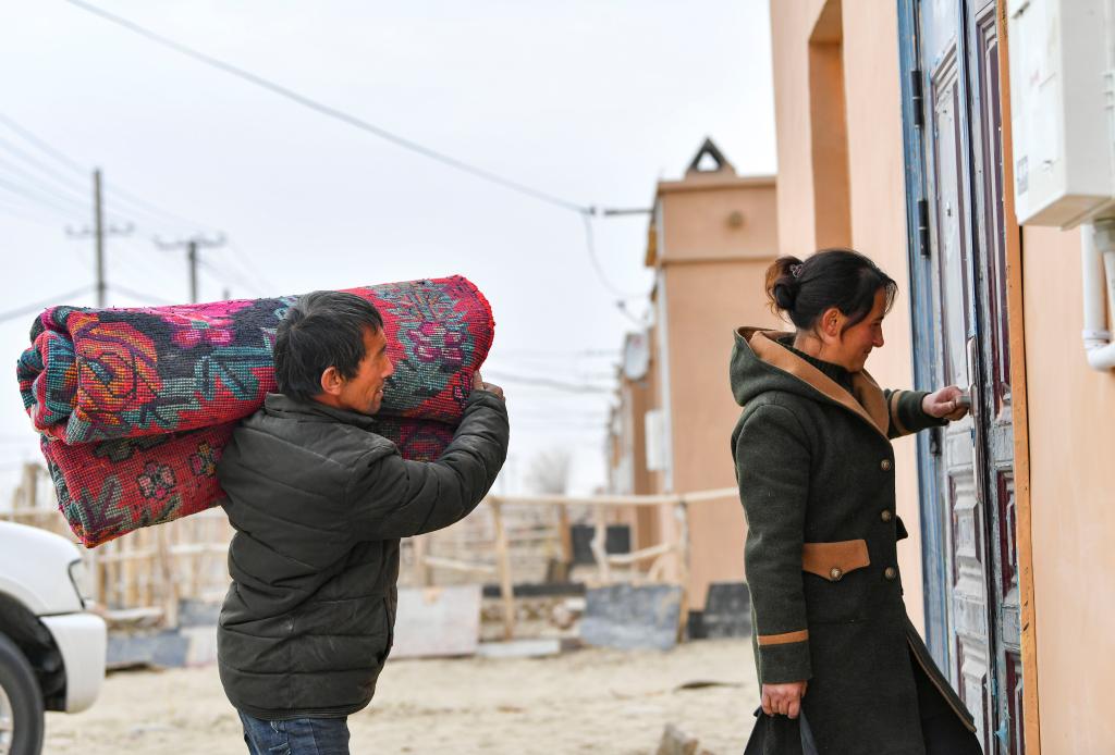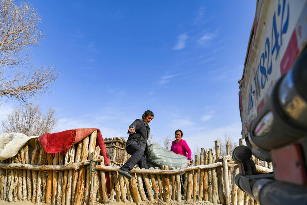 依明·買提庫爾班(前)和妻子抬著行李跨出老家的籬笆墻,準(zhǔn)備乘車前往安置點(2019年11月17日攝)。