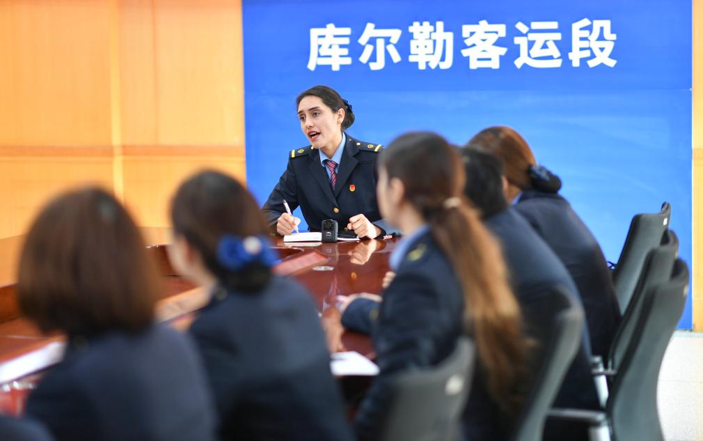 在中國鐵路烏魯木齊局集團有限公司庫爾勒客運段辦公樓,艾爾開牙·多力開帶領(lǐng)同事開展值乘前的業(yè)務(wù)學(xué)習(xí)(2025年1月15日攝)。