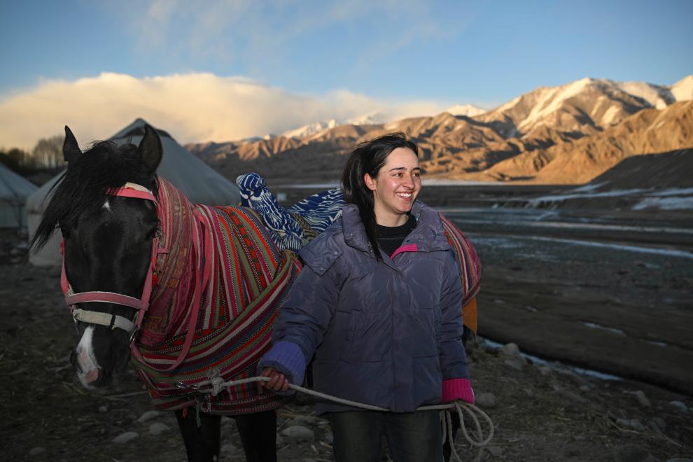 這是在新疆塔縣塔什庫爾干鄉(xiāng)薩熱吉勒尕村拍攝的馴馬中的古麗艾薩·迪汗(2025年3月21日攝)。她是全縣首位參加5000米速度賽馬的女騎手。