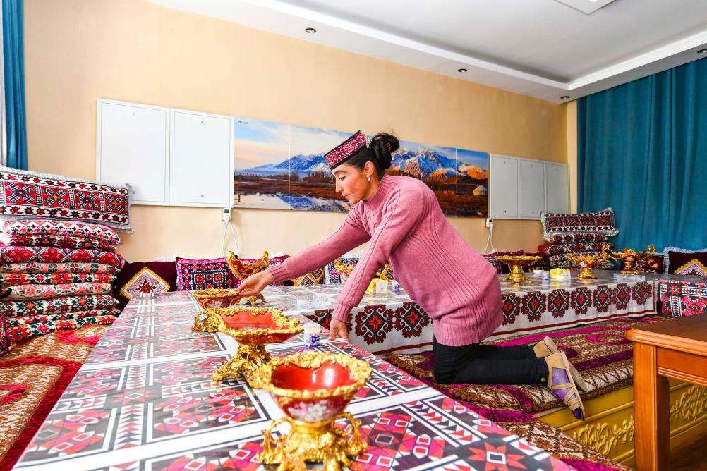 新疆塔什庫爾干塔吉克自治縣塔什庫爾干鄉(xiāng)瓦爾希迭村村民瑪依努爾古麗·依克木在民宿內(nèi)擺放物品,準(zhǔn)備招待游客(2020年6月4日攝)。