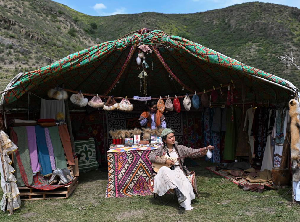 在烏魯木齊市水磨溝區(qū)的“夏牧場·游牧文化旅游節(jié)”上,北京姑娘周方怡(前)在展廳前彈奏冬不拉,她的“游牧”文創(chuàng)搭檔扎伊拉·也斯達吾列提在身后準(zhǔn)備展品(2024年6月15日攝)。