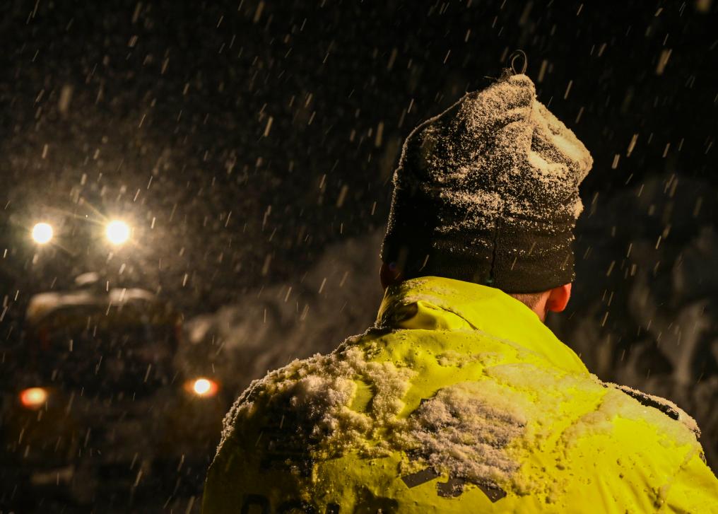 瑪依塔斯防風(fēng)雪搶險基地的工作人員頂風(fēng)冒雪搜尋被困旅客(2021年1月23日攝)。
