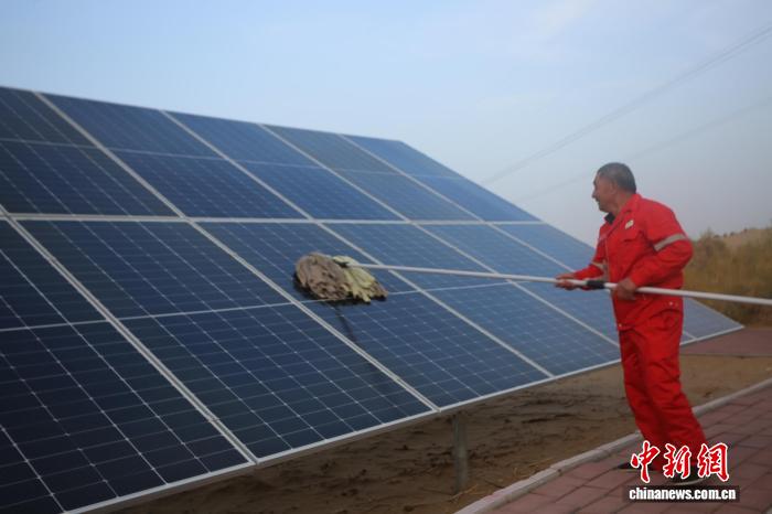 在塔里木沙漠公路48號(hào)井,看護(hù)員清理太陽能板上的沙塵。陶拴科 攝