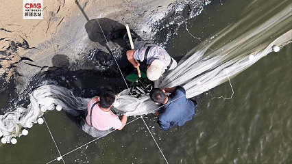 在且末縣水產(chǎn)養(yǎng)殖基地里,工人們正捕撈烏魚、沙錐魚等海產(chǎn)。當(dāng)?shù)赝ㄟ^鹽堿水還原海水技術(shù),成功實現(xiàn)沙漠海鮮養(yǎng)殖,規(guī)模達(dá)500畝以上,成活率達(dá)到96%。