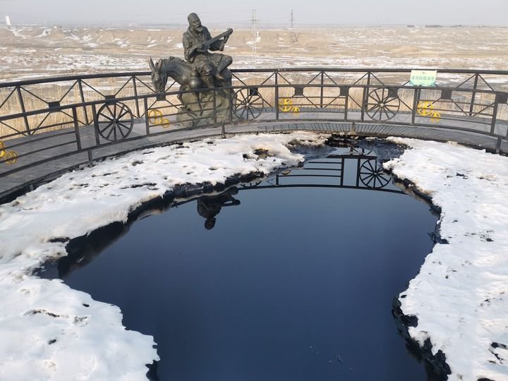 在鐫刻著“黑油山”三個(gè)大字的花崗巖石碑旁,散布著油泉涌溢形成的“黑油池”。池面如鏡,漆黑深邃,卻又泛著柔和的光澤,仿佛一塊被歲月打磨的墨玉,鑲嵌在黃褐色的沙礫之間。微風(fēng)拂過(guò),油面輕輕蕩漾,沉默與能量在此交織流淌,散發(fā)出獨(dú)特而厚重的氣息。