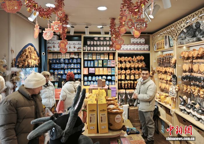 1月12日,在位于烏魯木齊市的新疆國際大巴扎內(nèi),游客在阿凡提文創(chuàng)專賣店挑選商品。 茍繼鵬 攝