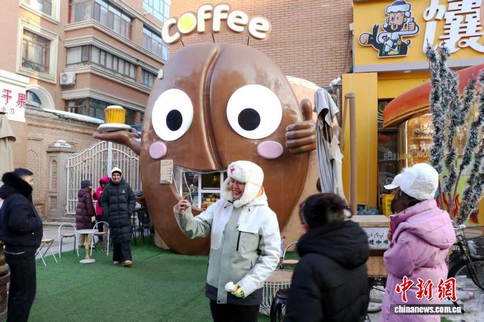 1月12日,在位于烏魯木齊市的新疆國際大巴扎內(nèi),游客在“馕咖啡”攤位前拍照打卡。 茍繼鵬 攝