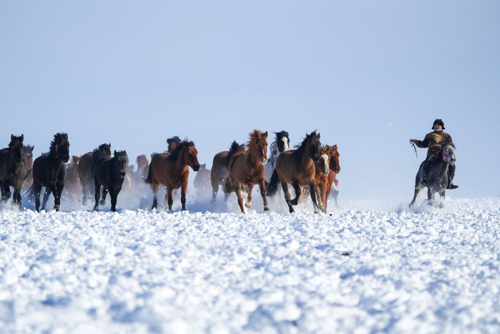 1月3日,新疆昭蘇縣濕地公園的“天馬踏雪”表演。新華社記者 徐宏巖 攝