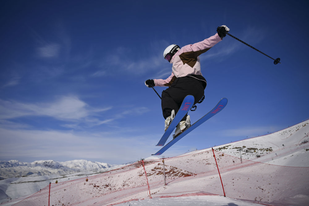雪友在新疆阿勒泰將軍山滑雪公園飛越跳臺(tái)。新華社記者 胡虎虎 攝