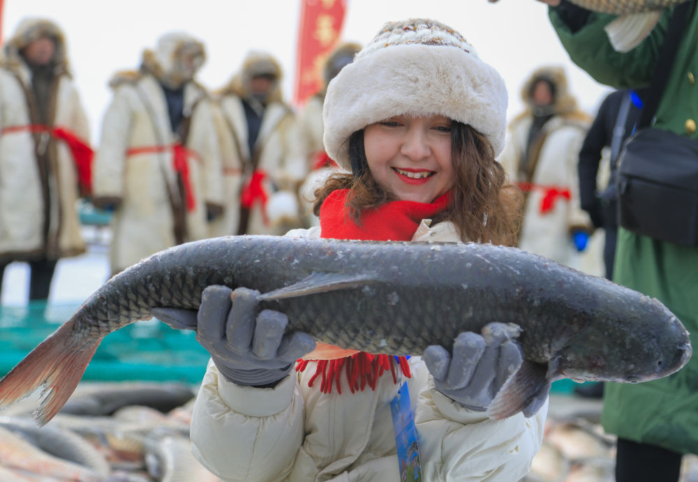 1月18日,在博斯騰湖冰面上,游客手捧剛打撈上來(lái)的博斯騰湖魚。新華社發(fā)(年磊攝)