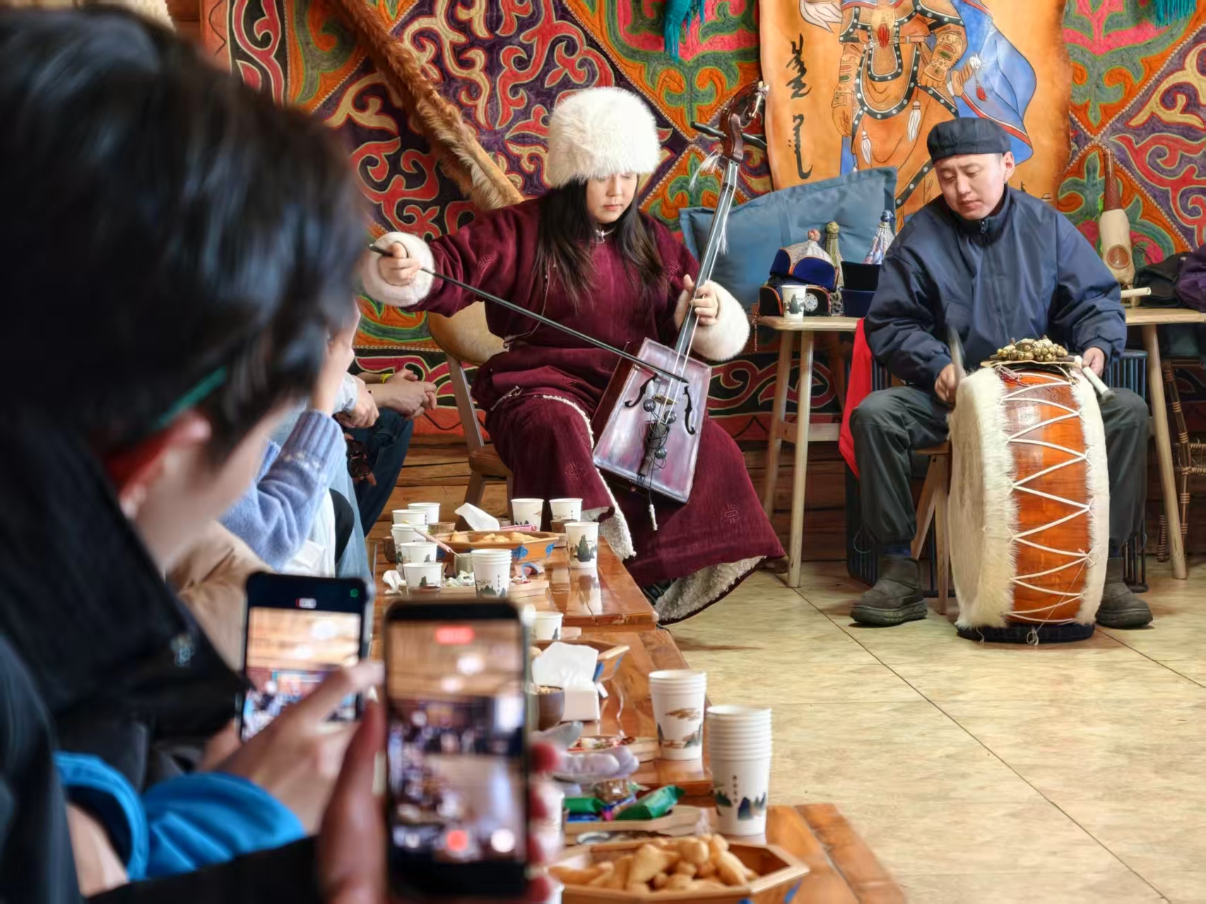“太震撼了,音樂一響,眼前仿佛就是無邊的草原和喀納斯柔美的山巒?!本妥x于臺(tái)灣長庚大學(xué)的鄭同學(xué)與同伴沉醉于羊皮鼓的鏗鏘力道與傳統(tǒng)樂器“蘇爾”的悠揚(yáng)余韻,情不自禁鼓掌贊嘆。