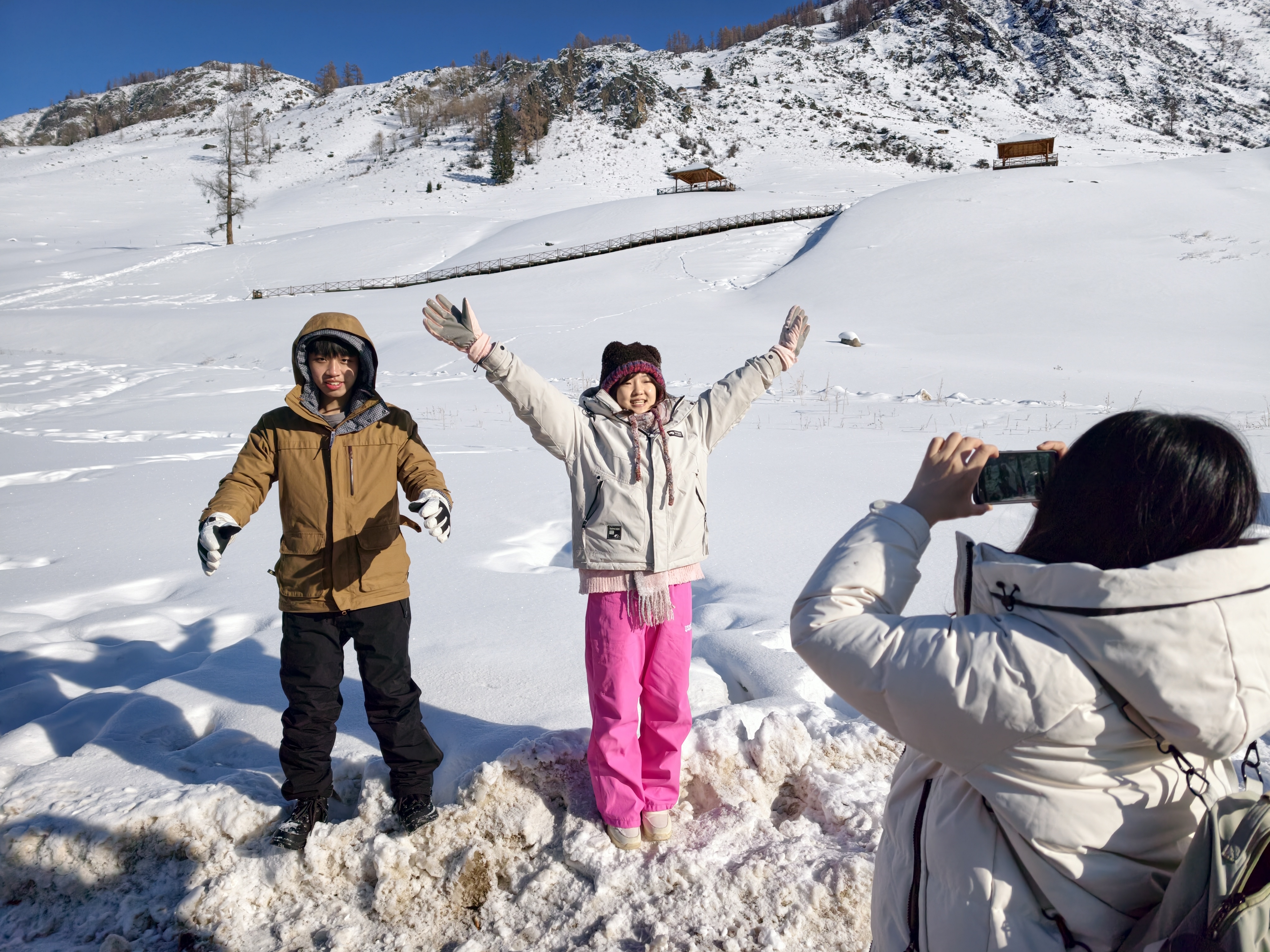 同學(xué)們激動(dòng)不已,紛紛奔向觀景臺(tái)。面對(duì)眼前圣潔壯美的高山雪域,震撼之情油然而生。“我看過不少地方的雪景,但這里的雪景之美堪稱‘天花板’級(jí)別?!眮碜耘_(tái)灣銘傳大學(xué)的何同學(xué)贊嘆道。