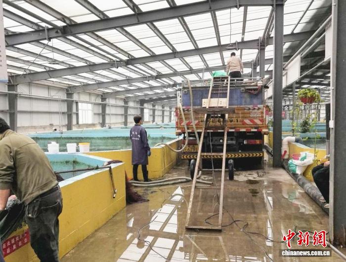 工人將捕撈上來的活魚轉(zhuǎn)運上車。楊景麗 攝